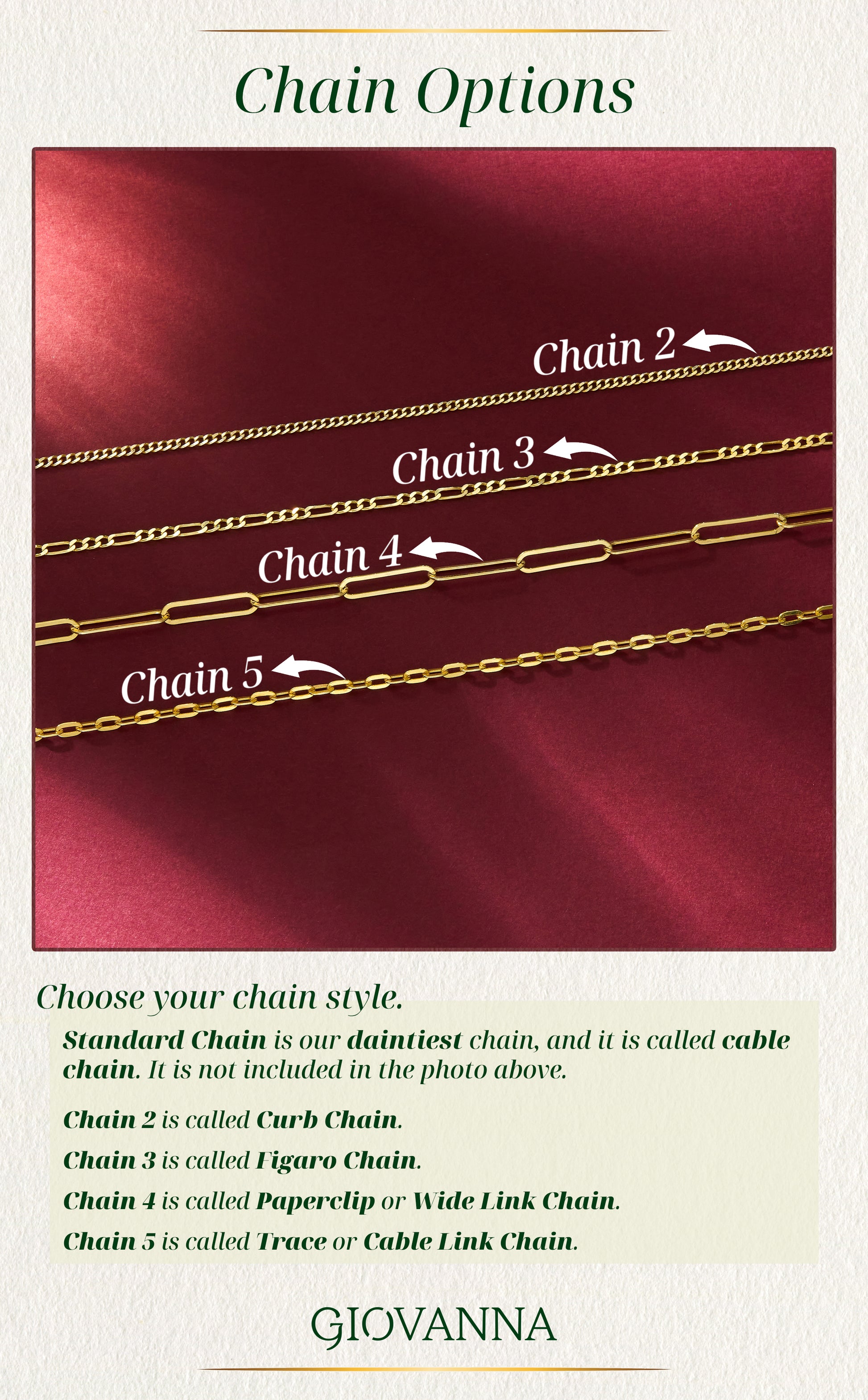 - 𝗖𝗵𝗮𝗶𝗻 𝗢𝗽𝘁𝗶𝗼𝗻𝘀: We offer a wide variety of 5 different chain types. (Cable Chain, Curb Chain, Figaro Chain, Paperclip Chain, Cable Link Chain)