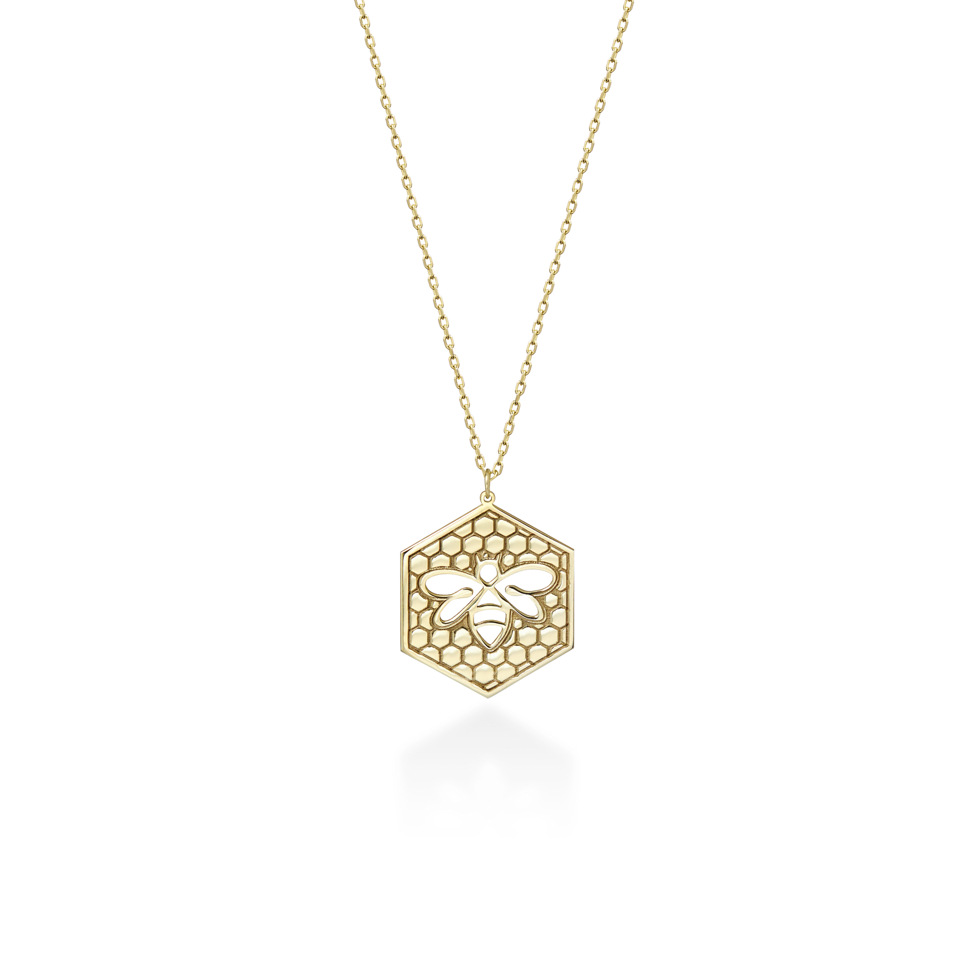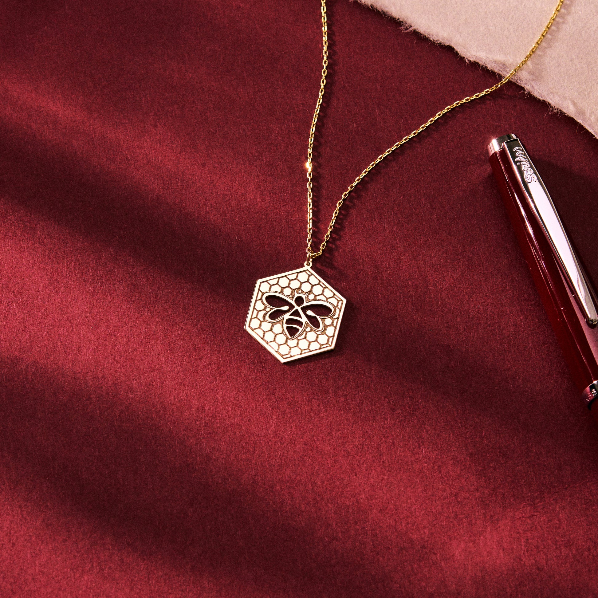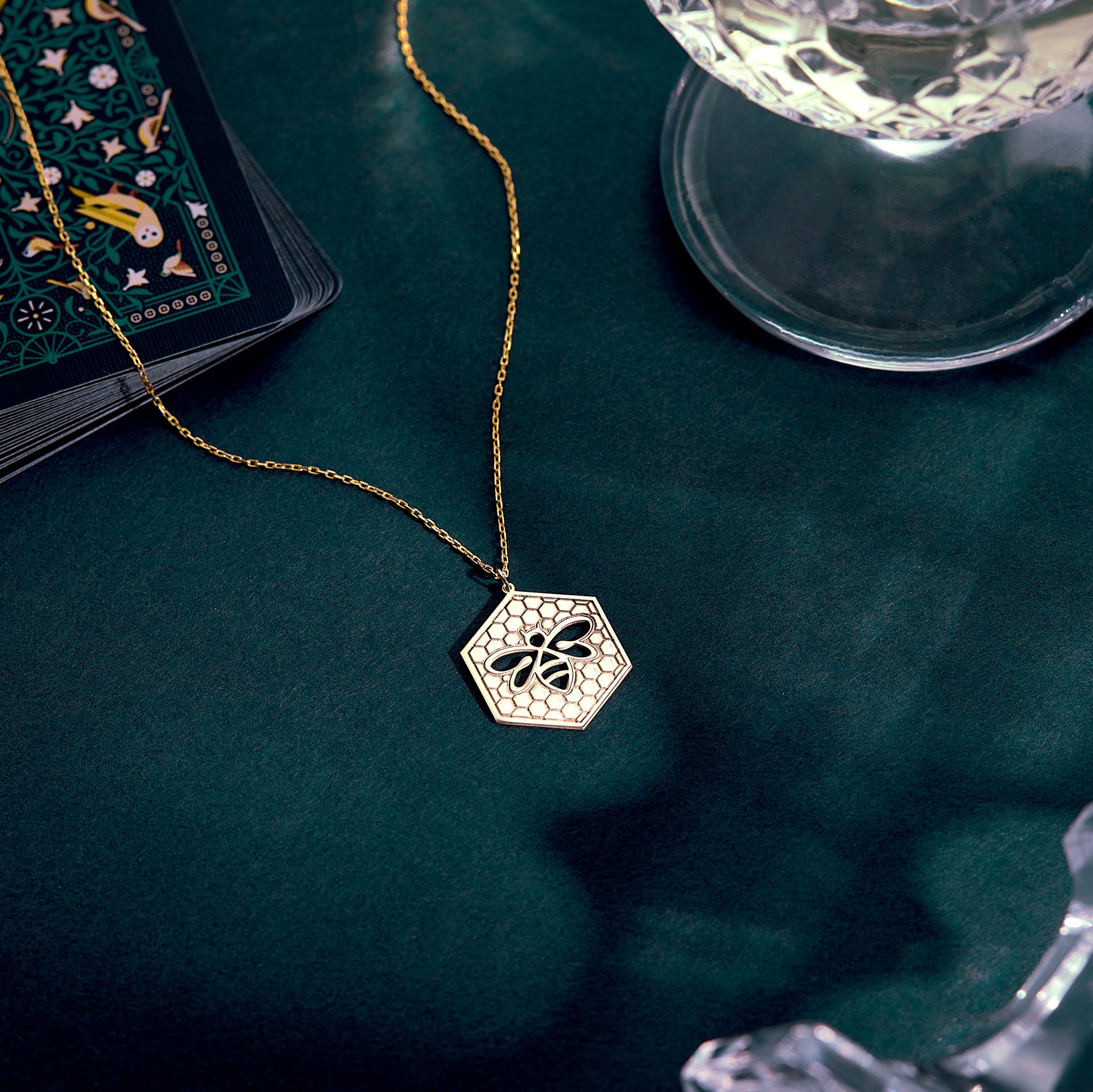 The Bee Necklace captures the harmony of nature and design. Its hexagonal honeycomb frame cradles a sculpted bee at its centerโan emblem of diligence and quiet strength. Handcrafted in sterling silver and finished with 14k gold vermeil, it pairs architectural precision with organic form, creating a piece that is both modern and timeless.