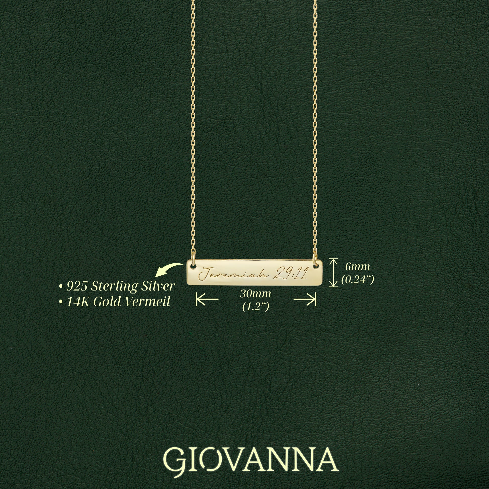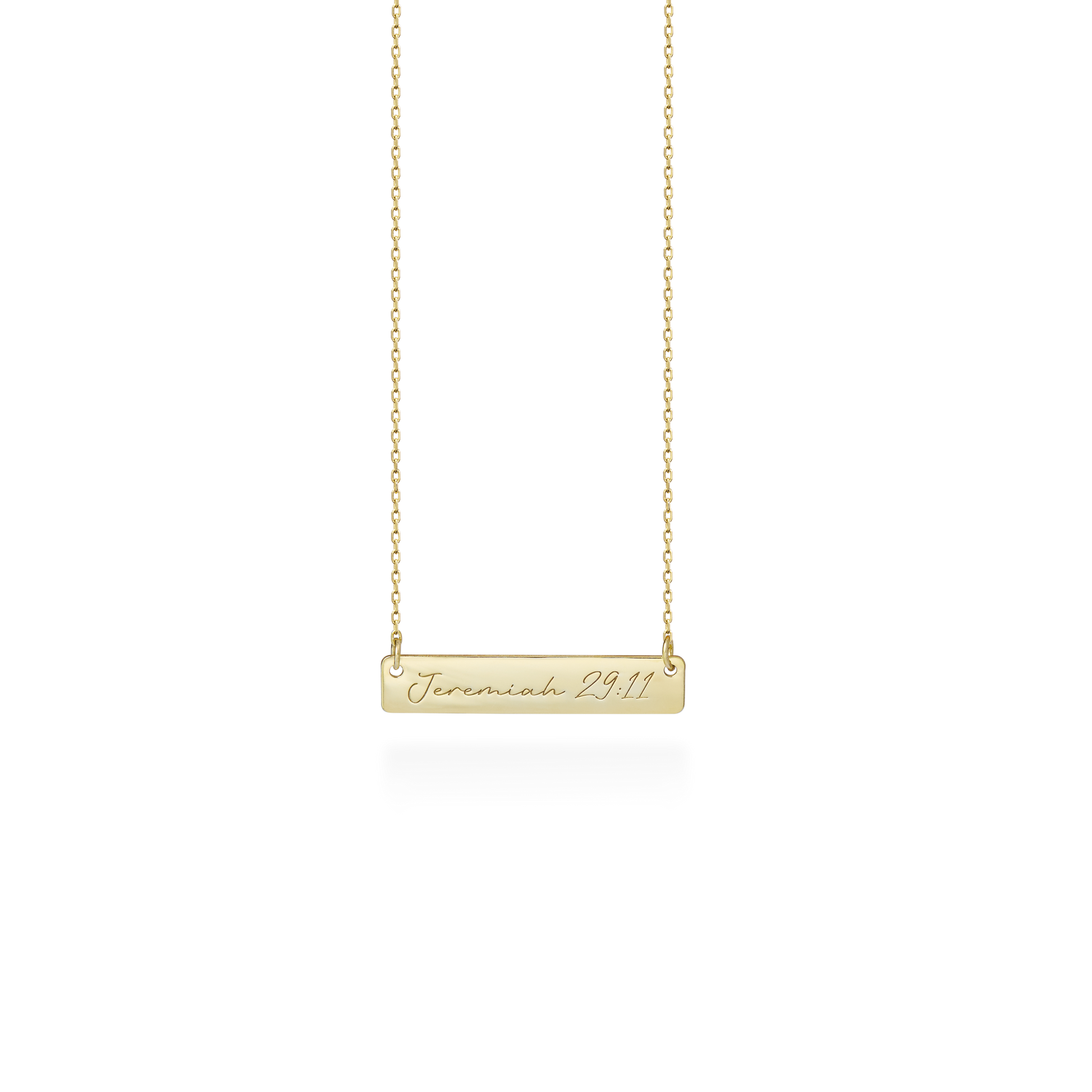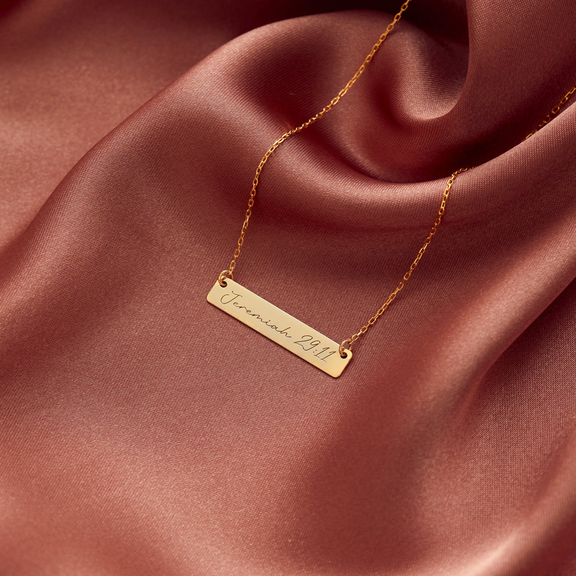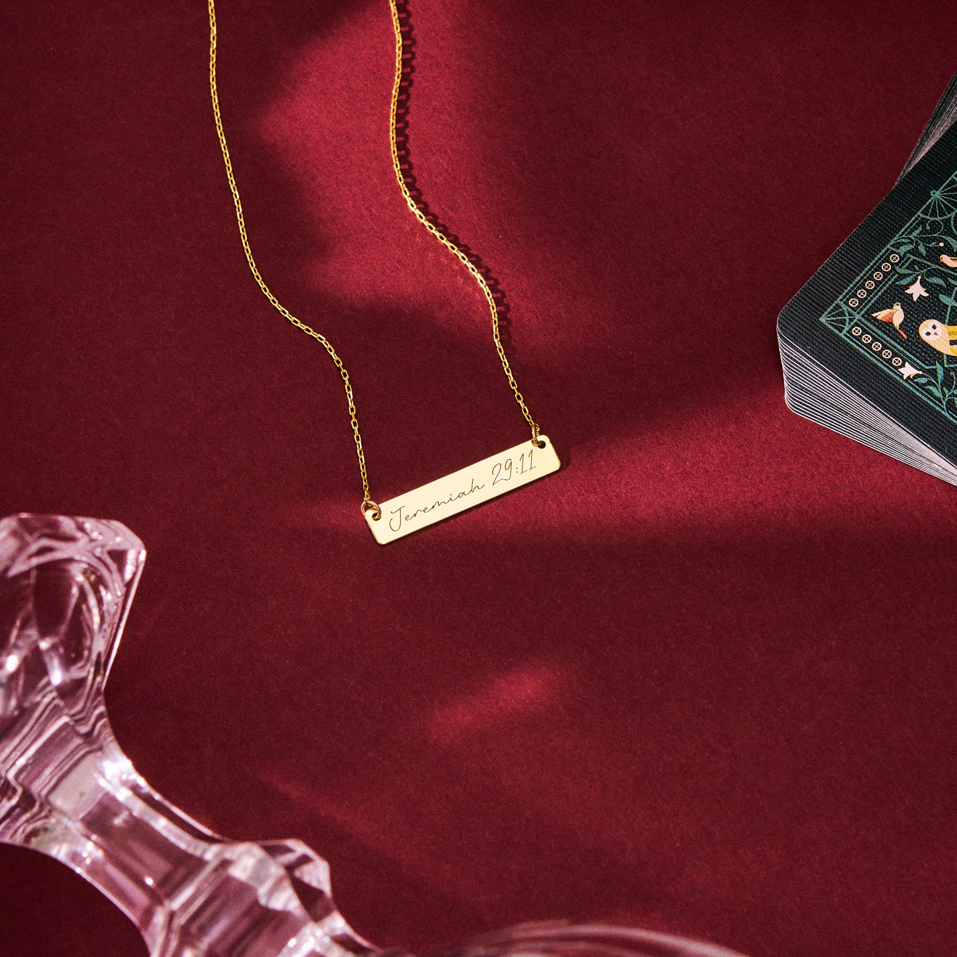 Theย Custom Bible Verse Necklace is a personal expression of faith. Handcrafted in sterling silver and finished with 14k gold vermeil, it features a slender bar pendant engraved with your chosen scripture. A piece of quiet devotion, it carries words of comfort and strength close to the heart.