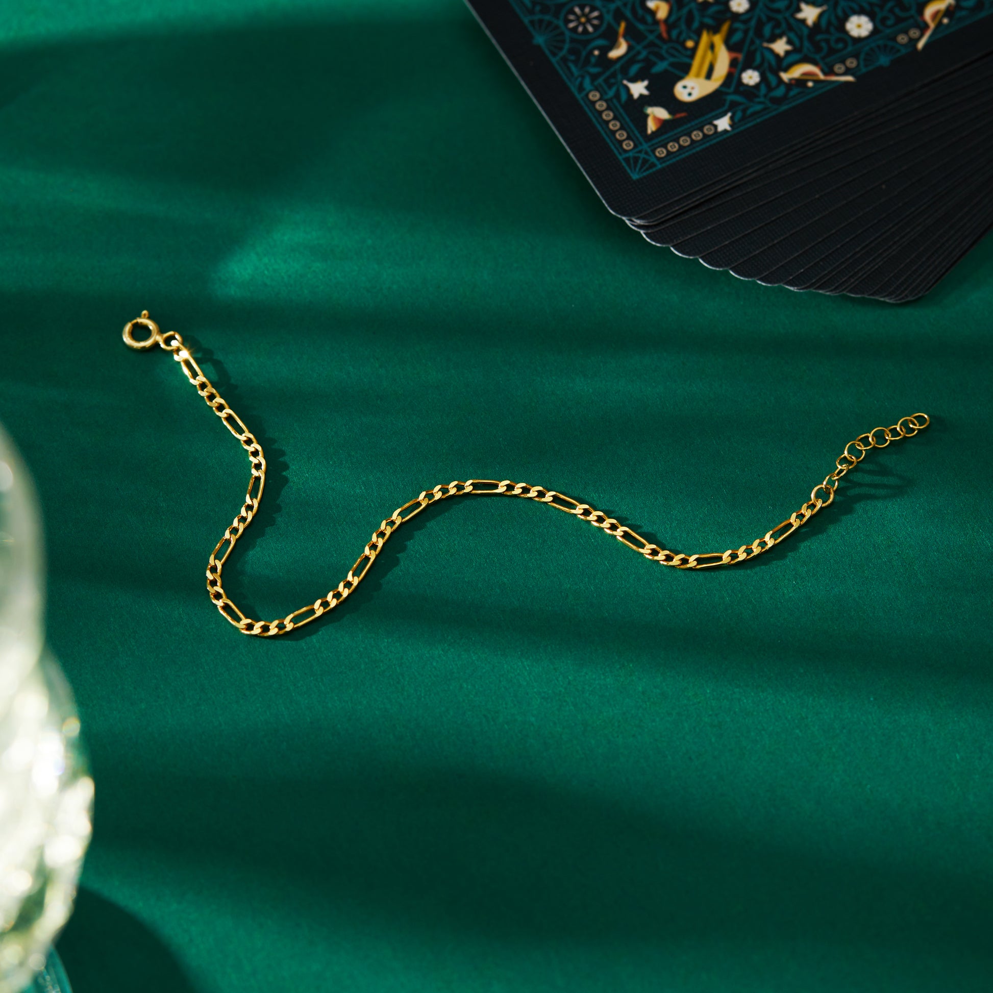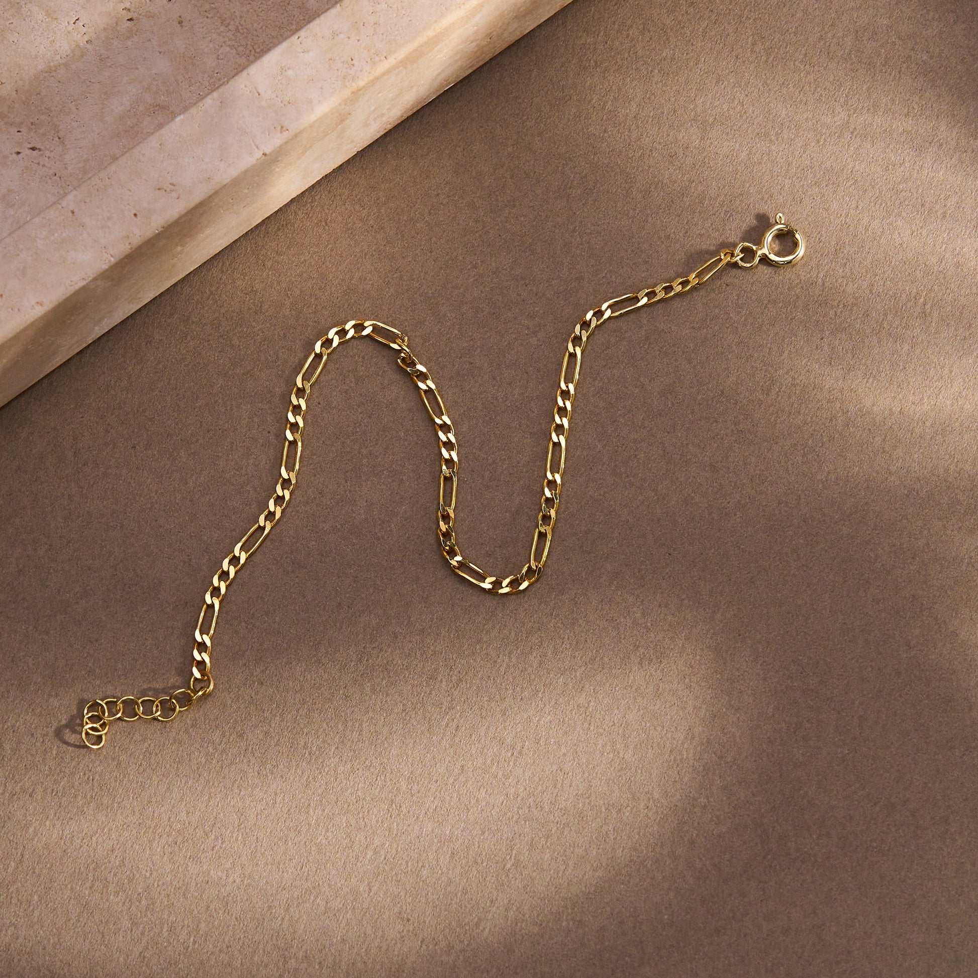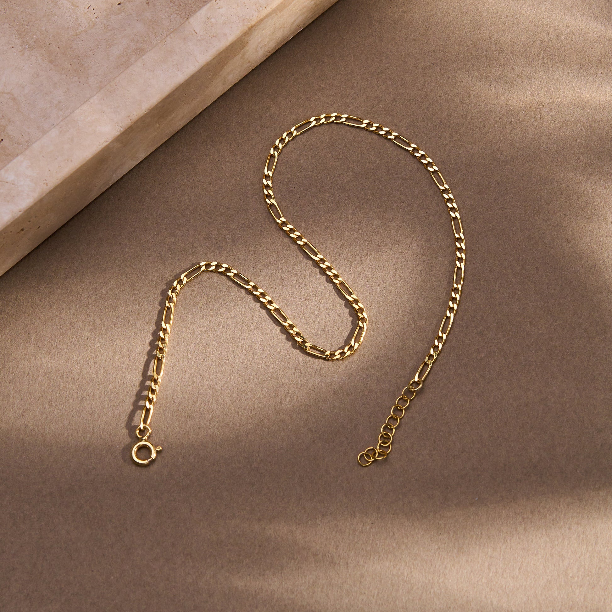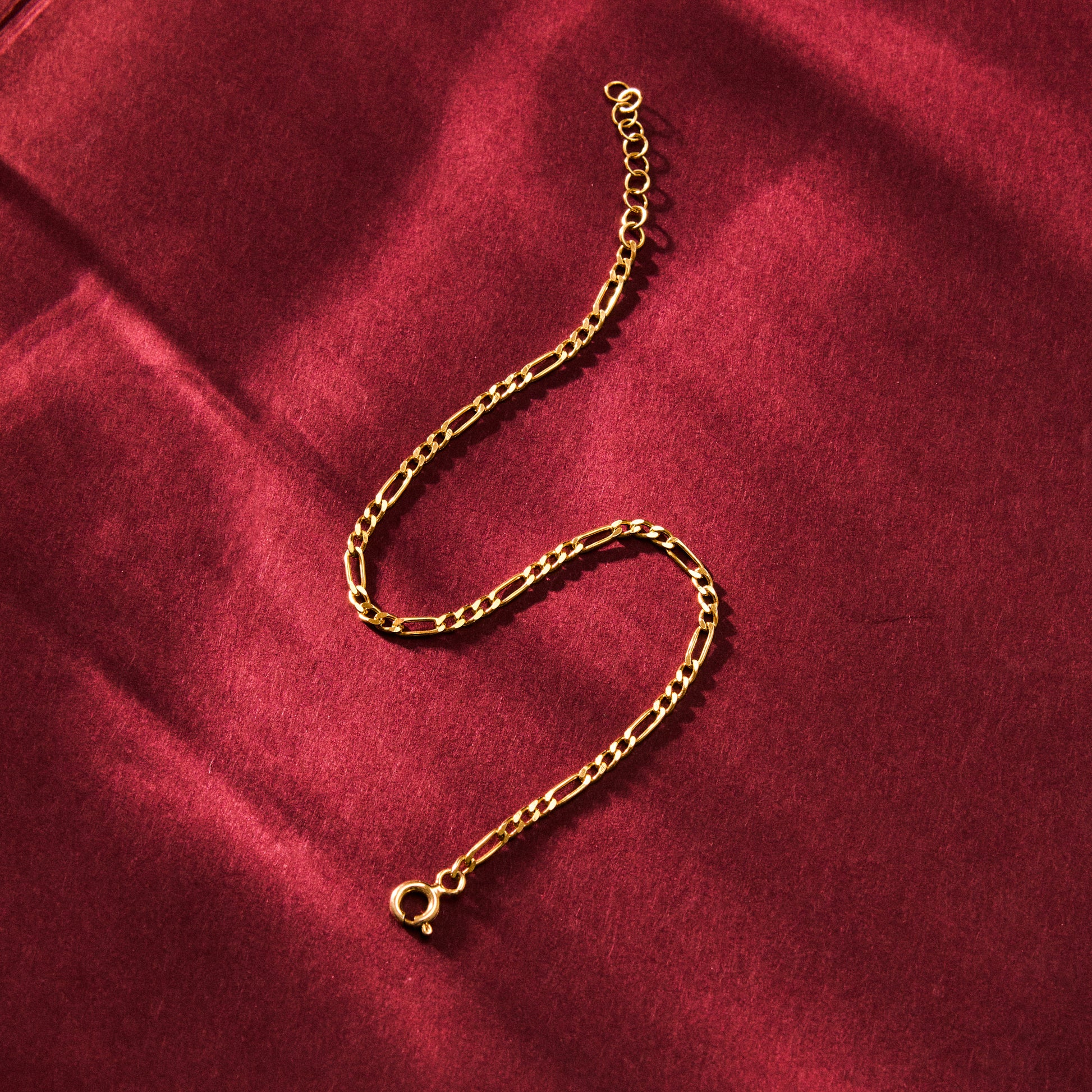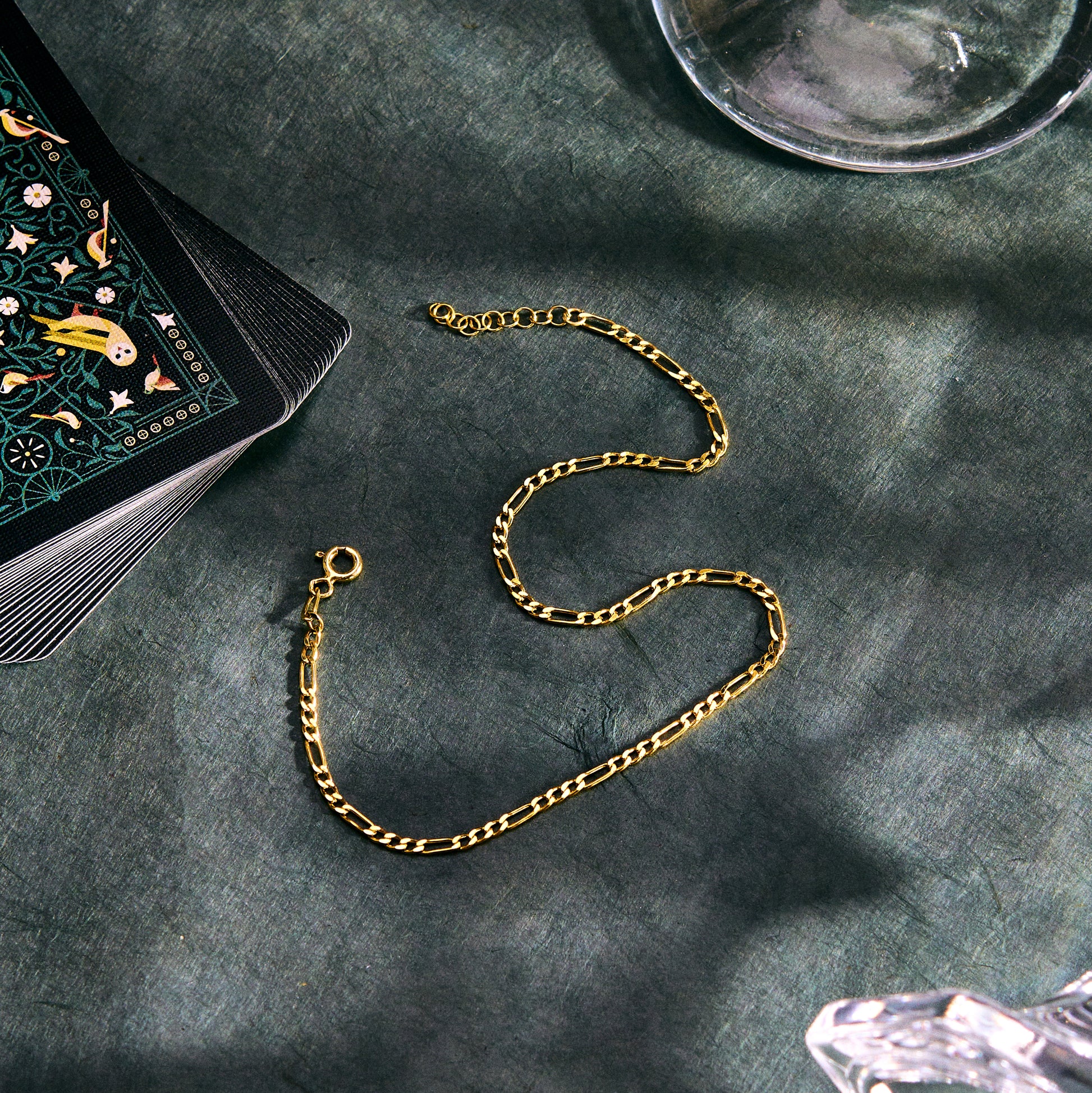 The Figaro Chain Anklet is defined by its signature pattern of alternating links, a balance of rhythm and restraint. Handcrafted in sterling silver and finished with 14k gold vermeil, it carries a classic Italian design reimagined for everyday wear. Its polished simplicity offers an enduring elegance with subtle character.