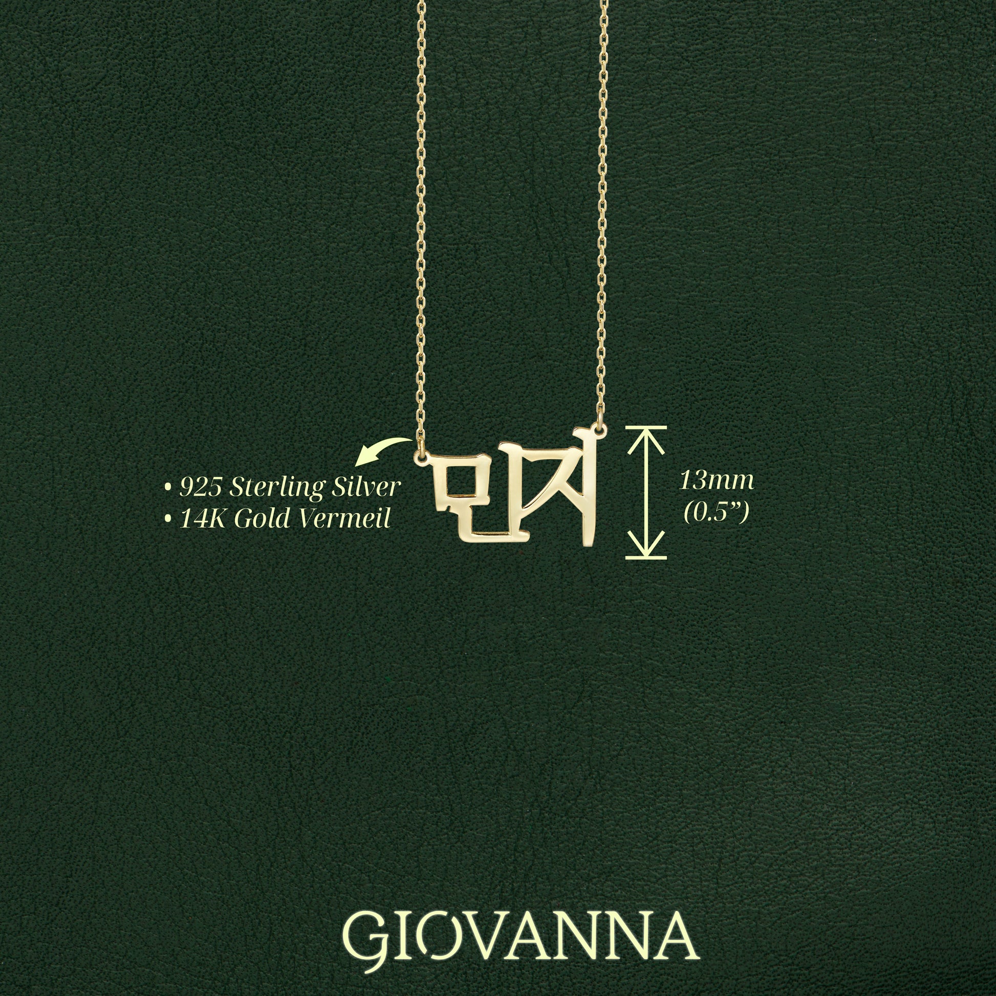 The Korean Name Necklace celebrates the elegance of Hangul, Koreaโs timeless script.ย Handcrafted in sterling silver and finished with 14k gold vermeil, it features your chosen name rendered in Hangul characters. A modern piece that celebrates language, identity, and individuality with subtle elegance.