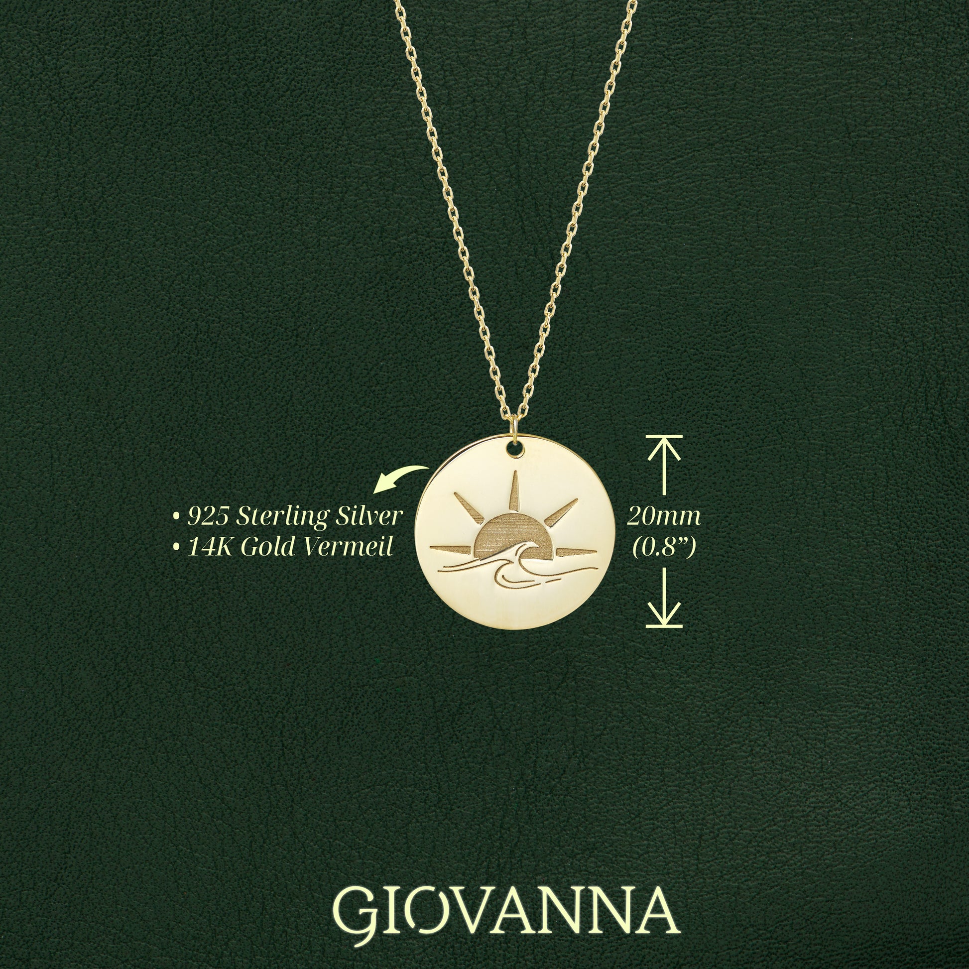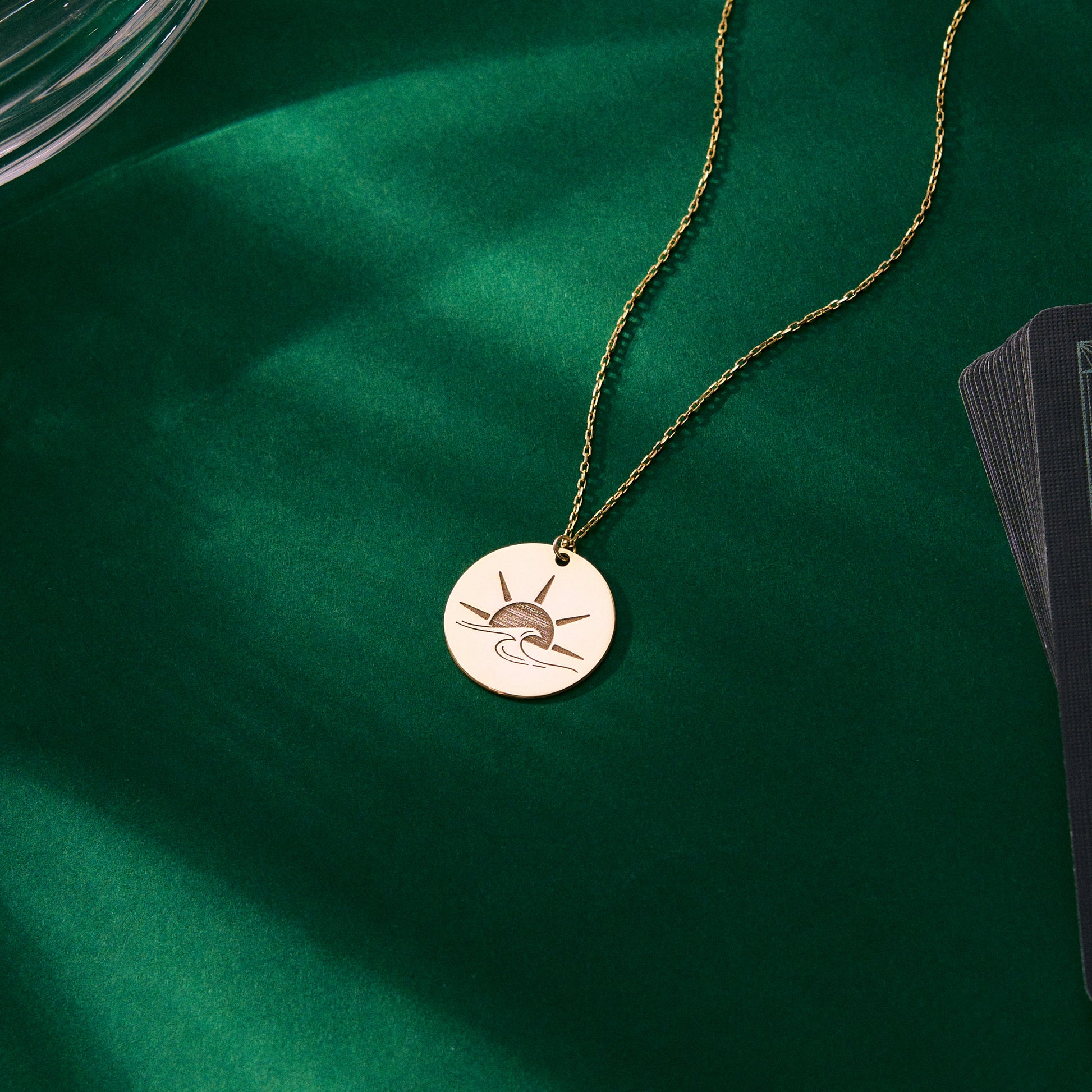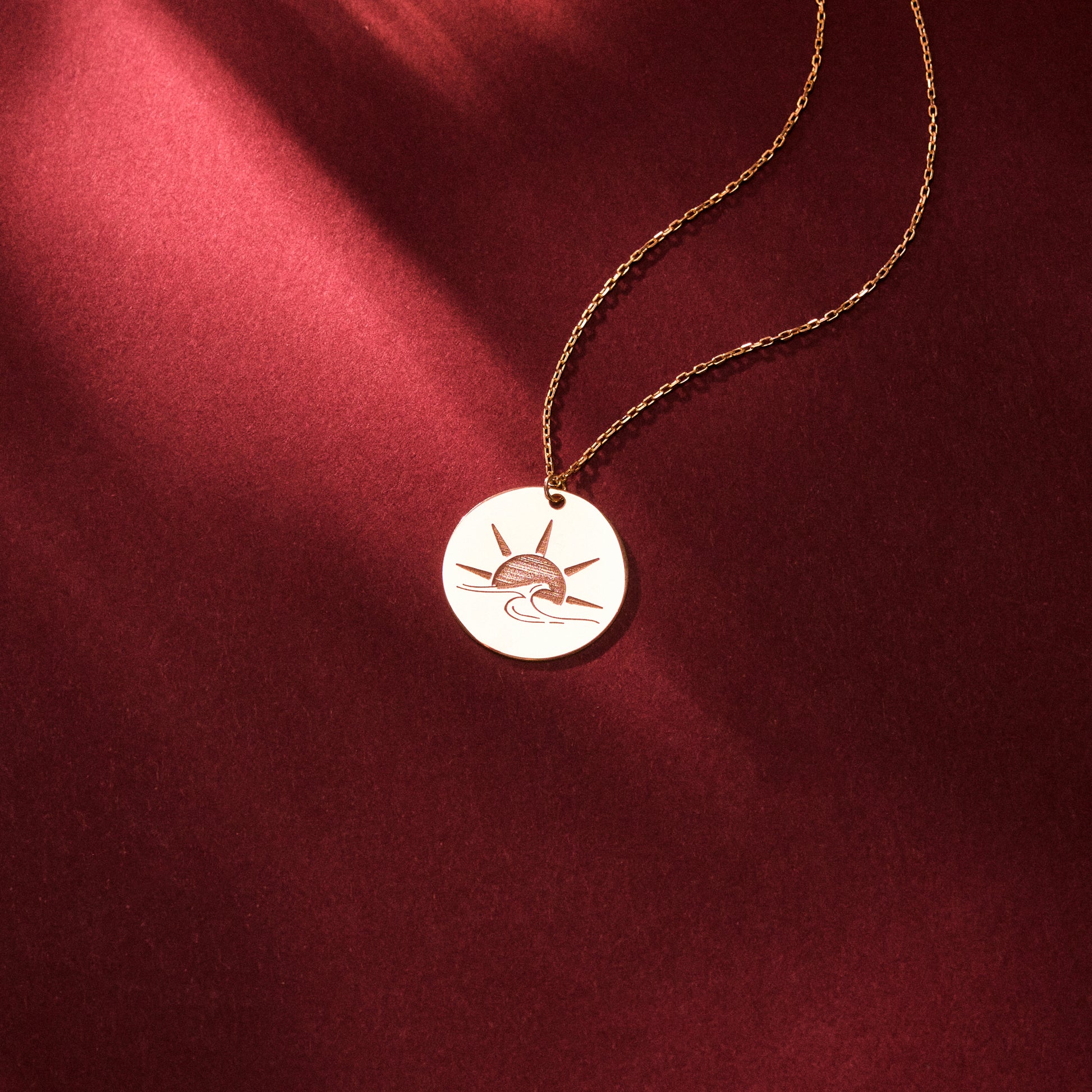 The Sun & Wave Necklace captures the essence of coastal serenity. Handcrafted in sterling silver and finished with 14k gold vermeil, its etched disc motif brings together the warmth of the sun and the rhythm of the sea in a single, fluid design. A piece that speaks to open horizons and quiet escapes, it carries the effortless calm of a day spent by the shore.